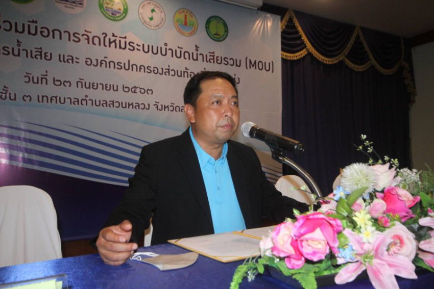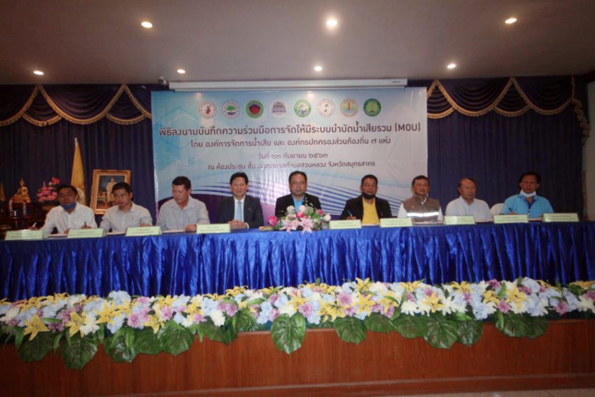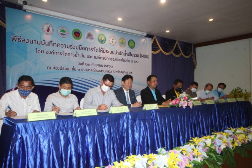 วันที่ 23 กันยายน 2563 เวลา 10.00 น. ณ ห้องประชุม ชั้น 3 เทศบาลตำบลสวนหลวง จังหวัดสมุทรสาคร นายชีระ วงศบูรณะ ผู้อำนวยการองค์การจัดการน้ำเสีย และผู้บริหารองค์กรปกครองส่วนท้องถิ่น อำเภอกระทุ่มแบน จังหวัดสมุทรสาคร ร่วมลงนามบันทึกความร่วมมือการจัดให้มีระบบบำบัดน้ำเสียรวม (MOU) โดยมี นายธีรพัฒน์ คัชมาตย์ รองผู้ว่าราชการจังหวัดสมุทรสาคร ร่วมลงนาม และ นายบรรพต จันทรวงษ์ กล่าวต้อนรับ รวมถึงเป็นสักขีพยาน