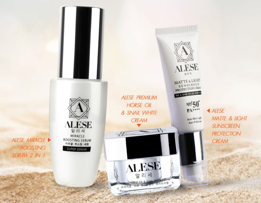 ผลิตภัณฑ์ภายใต้แบรนด์ ALESE Thailand ที่เปิดตัวในตลาดบิวตี้ในประเทศไทยได้แก่ ALESE PREMIUM HORSE OIL&SNAIL WHITE CREAM ครีมน้ำมันม้าผสมเมือกหอยทาก ALESE MIRACLE BOOSTING SERUM เซรั่มน้ำตบ 2 in 1 และ ALESE MATTE&LIGHT SUNSCREEN PROTECTION CREAM SPF50+ PA++++