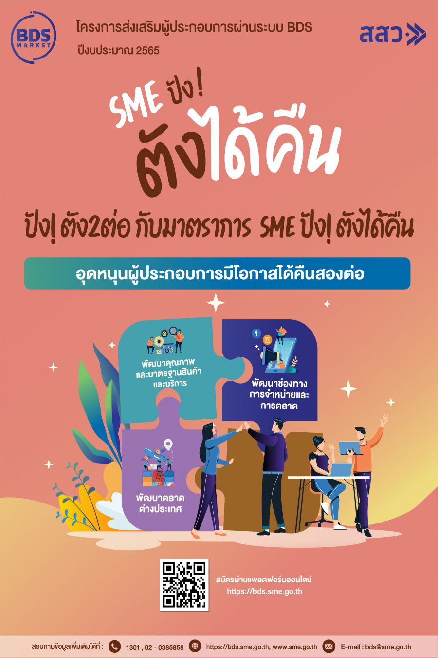 ตามมาตรการของทางสำนักงานส่งเสริมวิสาหกิจขนาดกลางและขนาดย่อม หรือ สสว. ประกาศให้ผู้ประกอบการ SME สามารถยื่นข้อเสนอเพื่อขอรับการบริการและการพัฒนาในด้านต่าง ๆ เช่น ด้านการพัฒนาคุณภาพและมาตรฐานสินค้าและบริการ ด้านการพัฒนาช่องทางการจำหน่ายและการตลาด และตลาดต่างประเทศ ฯลฯ ผ่านแพลตฟอร์มออนไลน์ BDS หรือเว็บไซต์ https://bds.sme.go.th