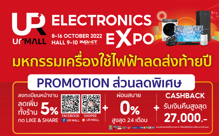 ยูเนี่ยนแพนฯ จัดงาน Electronic Expo by UR Mall มหกรรมเครื่องใช้ไฟฟ้าครบวงจร งานสุดท้ายของปี ภายใต้คอนเซ็ปต์ “โปรเดือด โปรแรงเด็ด” ที่มาพร้อมโปรโมชั่นลดกระหน่ำเครื่องใช้ไฟฟ้าหลากหลายแบรนด์ชั้นนำ ทั้งลดแลกแจกแถม รวมถึงจัดโปรโมชั่นสุดคุ้มผ่อน 0% นานสูงสุด 24 เดือน พร้อมรับ Cashback เงินคืนสูงสุด 27,000 บาท ซึ่งได้รับผลตอบรับอย่างดีตลอดการจัดงาน 6 วันที่ผ่านมา มีประชาชนให้ความสนใจเข้าร่วมงานอย่างคึกคัก ณ อาคาร 9-10 อิมแพ็ค เมืองทองธานี เชื่อมั่นจะดันเศรษฐกิจไทยฟื้นตัวไตรมาสุดท้ายปี 2565