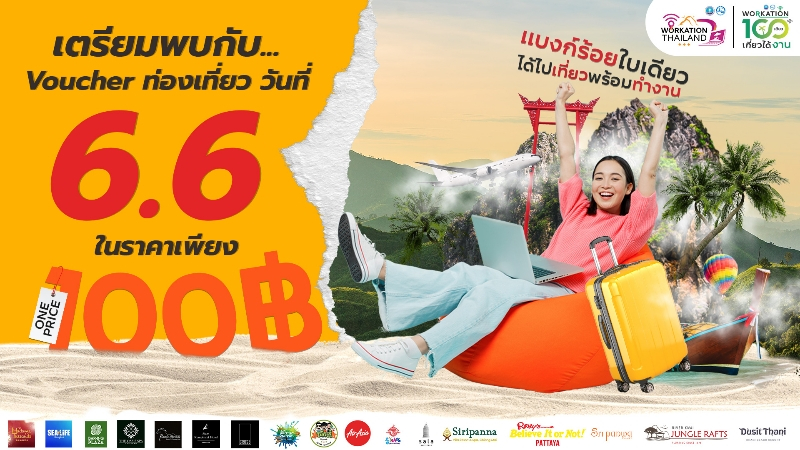 ททท. ลดกระหน่ำครั้งยิ่งใหญ่ กับ Voucher ท่องเที่ยวราคาพิเศษเพียง 100 บาท! ผ่านกิจกรรมส่งเสริมการขาย “Workation Thailand 100 เดียวเที่ยวได้งาน” เริ่มรอบแรกในวันที่ 6 เดือน 6
