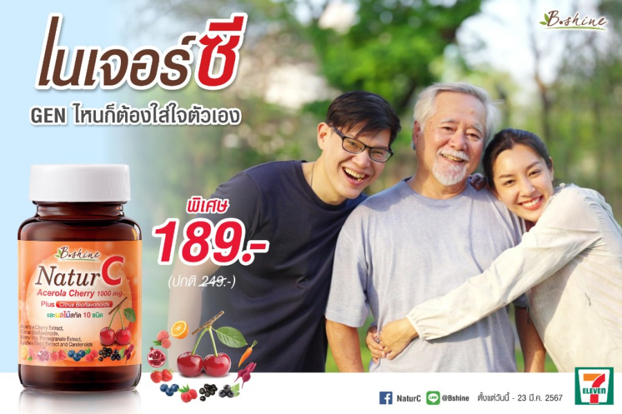 “บีไชน์ เนเจอร์ซี” วิตามินซีธรรมชาติ 100% ขนาดบรรจุ 30 เม็ด แถมฟรีอีก 5 เม็ดในขวด รวมเป็น 35 เม็ด จัดโปรโมชั่นสุดคุ้มลดราคาพิเศษ เหลือเพียง 189 บาท จากปกติ ราคา 249 บาท ตั้งแต่วันนี้ – 23 มีนาคม 2567 หาซื้อได้ที่ร้านเซเว่น อีเลฟเว่น ทุกสาขาทั่วประเทศ สามารถดูข้อมูลเพิ่มเติมได้ที่ www.bshine.co.th, FB : https://www.facebook.com/naturcacerolacherry และ Line : @Bshine