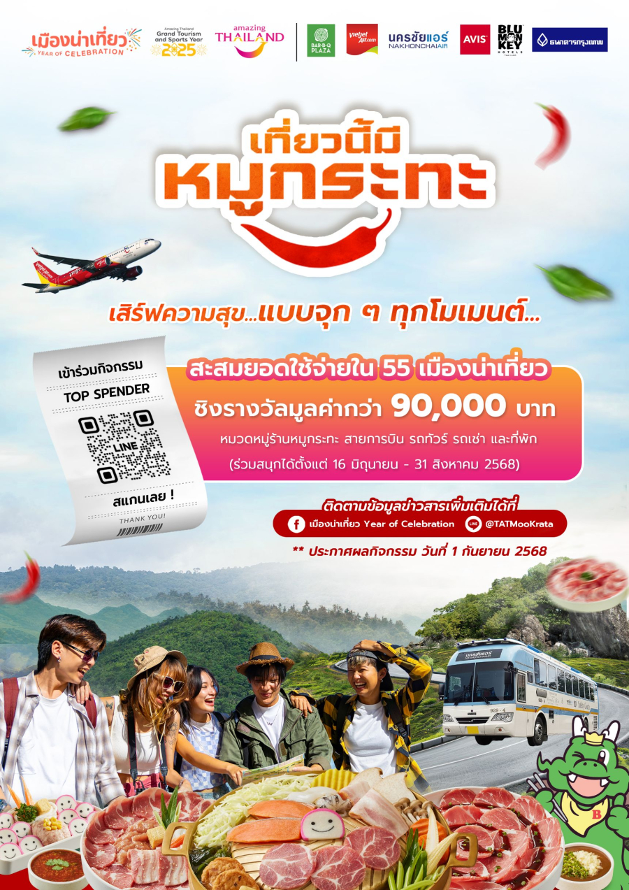 พร้อมสร้างประสบการณ์ท่องเที่ยวสุดล้ำที่ตอบโจทย์ทุกไลฟ์สไตล์ โดยเฉพาะแคมเปญไฮไลต์ “เที่ยวนี้มีหมูกระทะ” ที่ยกสุดยอดร้านหมูกระทะระดับตำนานจาก 55 จังหวัดทั่วไทยขึ้นแท่นแลนด์มาร์กใหม่ของสายกินและสายแชร์ พาแฟนหมูกระทะลัดเลาะลิ้มรสความฟินในบรรยากาศหน้าฝนที่ห้ามพลาด!